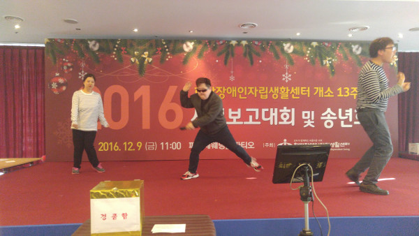 2016년 사업보고대회 및 송년회 김명석 뎃글수 0 조회수 2623 작성일 2016.12.19 12월 9일 제4회 한밭장애인자립생활의 날을 맞아 서구 월평동 패션월드 3층 피렌체웨딩홀에서 한밭장애인자립생활센터 개소 13주년 기념 2016년 사업보고대회 및 송년회를 개최하였습니다. 이날 행사는 장애인과 활동보조인, 지역 관계자 300여명이 참석한 가운데 2016년 사업보고를 시작으로, 중증장애인의 자립생활을 위해 많은 노력을 한 분들에 대한 시상과 감사패 전달, 장기자랑, 경품 추첨 등 즐거운 교류의 시간으로 진행되었습니다. 올해 자립생활대상은 장애인당사자 이갈렙, 활동보조인 정정숙님이 수상하였고, 장애인의 삶을 질을 높이는데 큰 힘이 되어준 활동지원 종사자들을 격려하는 서구청장상은 활동보조인 신미영, 이미화, 하은옥, 한명심님이 수상하였으며, 난관을 극복하고 자립생활을 실현한 장애인 당사자 유경화, 박진희, 이태원, 김명석님에게 서구의회의장상이 수여됐습니다. 왕성한 사회활동으로 자립생활을 하고 있는 장애인과 그를 위해 노력하고 있는 활동보조인에게 수여한 박병석 국회의원상은 장석란, 김선경님, 박범계 국회의원상은 백승미, 이래용님이 수상했습니다. 마지막으로 헌신적인 봉사와 나눔으로 자립생활을 지원한 애듀비전 박춘자대표님과 서대전네거리역 이충선역장님에게 감사패를 전달했습니다. 이어 중증장애인 엄일섭님이 ‘즐거운 나의 집’과 ‘사랑으로’를 코보드연주(코로 키보드를 연주)하여 시상식에 상을 수여한 분들과, 비록 상을 받지 못했지만 수상자 못지않게 수고한 모든 분들을 축하하고 격려하는 감동의 시간을 가졌습니다. 시상식 및 점심식사에 이어 오후에는 2016년 한 해 동안 열심히 활동해주신 이용자와 활동보조인이 같이하는 즐거운 장기자랑과 경품추첨 한마당이 이어졌습니다. 이때에는 특별공연으로 문화센터 회원 20여명이 멋진 율동과 노래로 흥을 북돋았으며, 장기자랑은 이용자 및 활동보조인 가운데 총 10팀이 출전하여 그동안 감추어 두었던 재능들을 맘껏 펼치며 모두가 함께 하는 즐거운 시간을 보냈습니다.