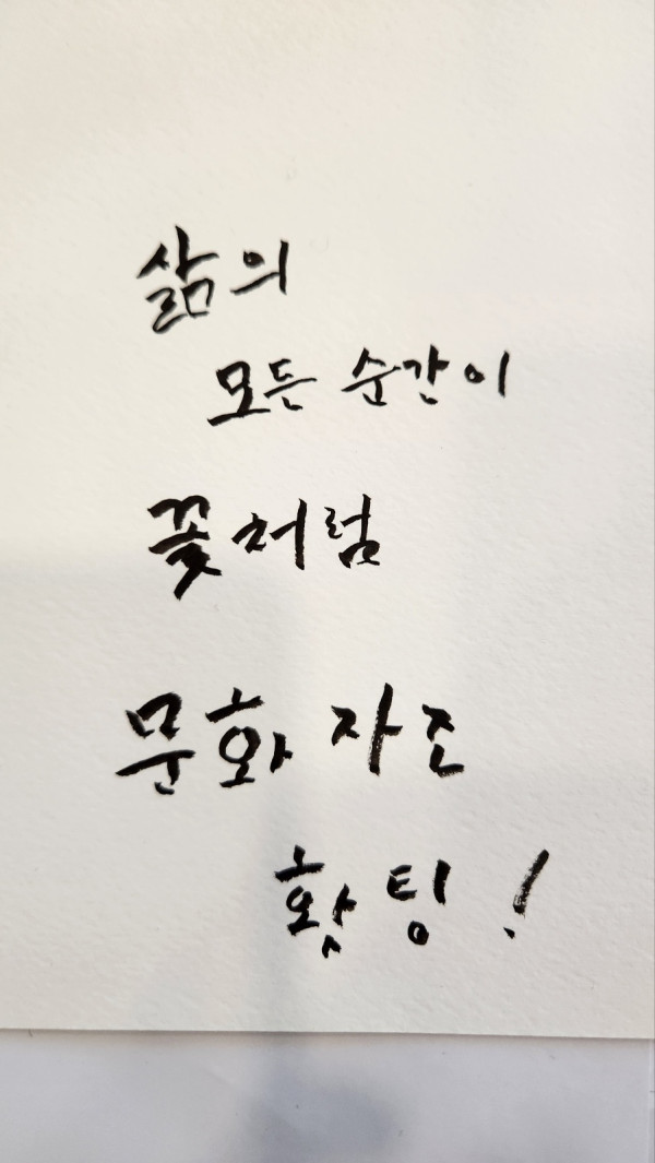 자조모임-문화누리 4월 모임 김소희 뎃글수 0 조회수 2379 작성일 2024.04.11 지난 4월 6일 수요일, 문화누리 회원들은 비가 와서 벚꽃놀이 대신 화폐박물관 카페에서 캘리그라피 체험을 했어요~ '삶의 모든 순간이 꽃처럼 문화 자조 홧팅!' 너무 아름다운 글이에요~ 화폐박물관 1층에서 진행중인 꽃꽂이 포토존에서 사진도 찍구요~ 1층 로비에서 사진도 찍으며 추억을 남겼습니다~ 비가 와서 더 운치있네요~ 문화누리 회원들은 5월에 기차 여행을 갈 예정입니다~