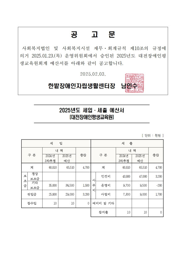 [ 2025년 정기총회 결과보고 ] 박선희 뎃글수 0 조회수 775 작성일자 2025.02.03 [2025년 정기총회 결과보고] 1. 일시 및 장소 : 2025.01.23.(목) / 한밭장애인자립생활센터 교육장 2. 참석인원 : 정회원 96명 중 43명 출석 3. 승인안건 : 출석회원 43명의 만장일치로 의결됨 가. 2024년 세입.세출 결산 나. 2025년 사업계획(안) 다. 2025년 세입.세출 예산(안) 4. 예.결산 홈페이지 공고 가. 관련규정: 사회복지법인 및 사회복지시설 재무.회계 규칙 제10조 ④시설의장은 시설의 게시판과 인터넷 홈페이지에 20일이상 공고 나. 공고내용 ① 2024년도 세입.세출 결산서(일반회계,활동지원회계,대전장애인평생교육원회계) ② 2025년도 세입.세출 예산서(일반회계,활동지원회계,대전장애인평생교육원회계) 다. 공고방법 : 인터넷 홈페이지(www.hbcil.or.kr)게시